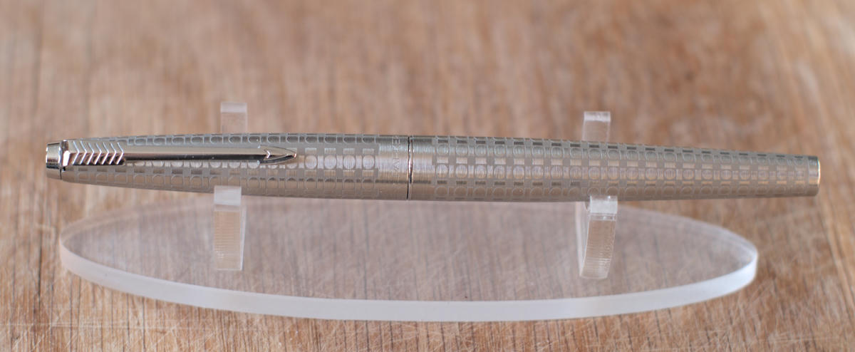 Stainless steel barrel and cap. Nib is medium width stainless steel, likely Parker's "Octanium" alloy.